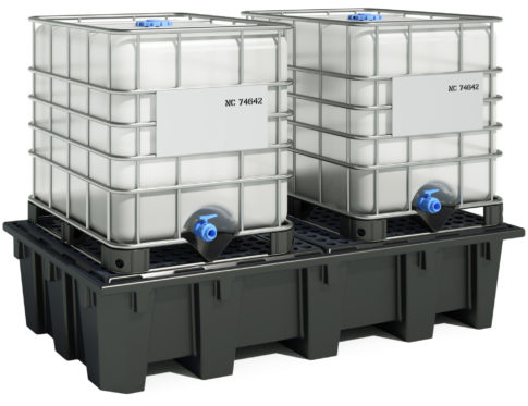 Bac de rétention pour 2 cubitainers de 1000 L côte à côte, finition polyéthylène. Modèle avec passages de fourches permettant l’utilisation d’un gerbeur.
